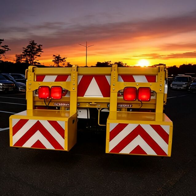 This is a mobile crash cushion truck for roadwork operations. It absorbs impact energy in the event of a rear-end collision to protect frontline workers and equipment.
